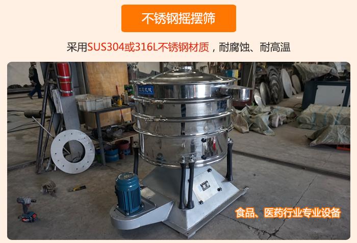不銹鋼搖擺篩主要采用SUS304或316L不銹鋼材質(zhì),耐腐蝕、耐高溫、不易生銹、不污染原料,是食品、醫(yī)藥行業(yè)專用篩分設(shè)備。由于不銹鋼搖擺篩模擬了人類手工篩分動(dòng)作和過程,做三維圓周運(yùn)動(dòng),巧妙的把篩(平面圓周運(yùn)動(dòng))、簸(向上拋物運(yùn)動(dòng))結(jié)合起來,既有圓周運(yùn)動(dòng),又有上拋運(yùn)動(dòng),所以搖擺篩具有篩分精度高、效率高、產(chǎn)量大、篩網(wǎng)壽命長(zhǎng)的特點(diǎn)(可達(dá)到普通振動(dòng)篩的5-10倍),應(yīng)用于各種精細(xì)、超細(xì)范圍內(nèi)的微粒狀物料,更加適合難以處理的物料。